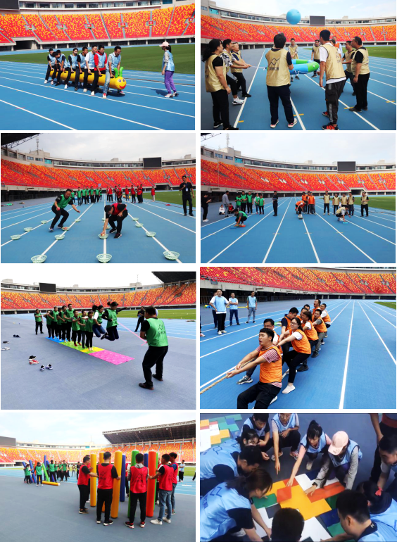 本次趣味運動會共設(shè)置8個比賽項目,分別是瘋狂毛毛蟲、眾星捧月、俄羅斯方塊、袋鼠運瓜、指壓板闖關(guān)、摸石頭過河、田間一條龍和團隊拔河。